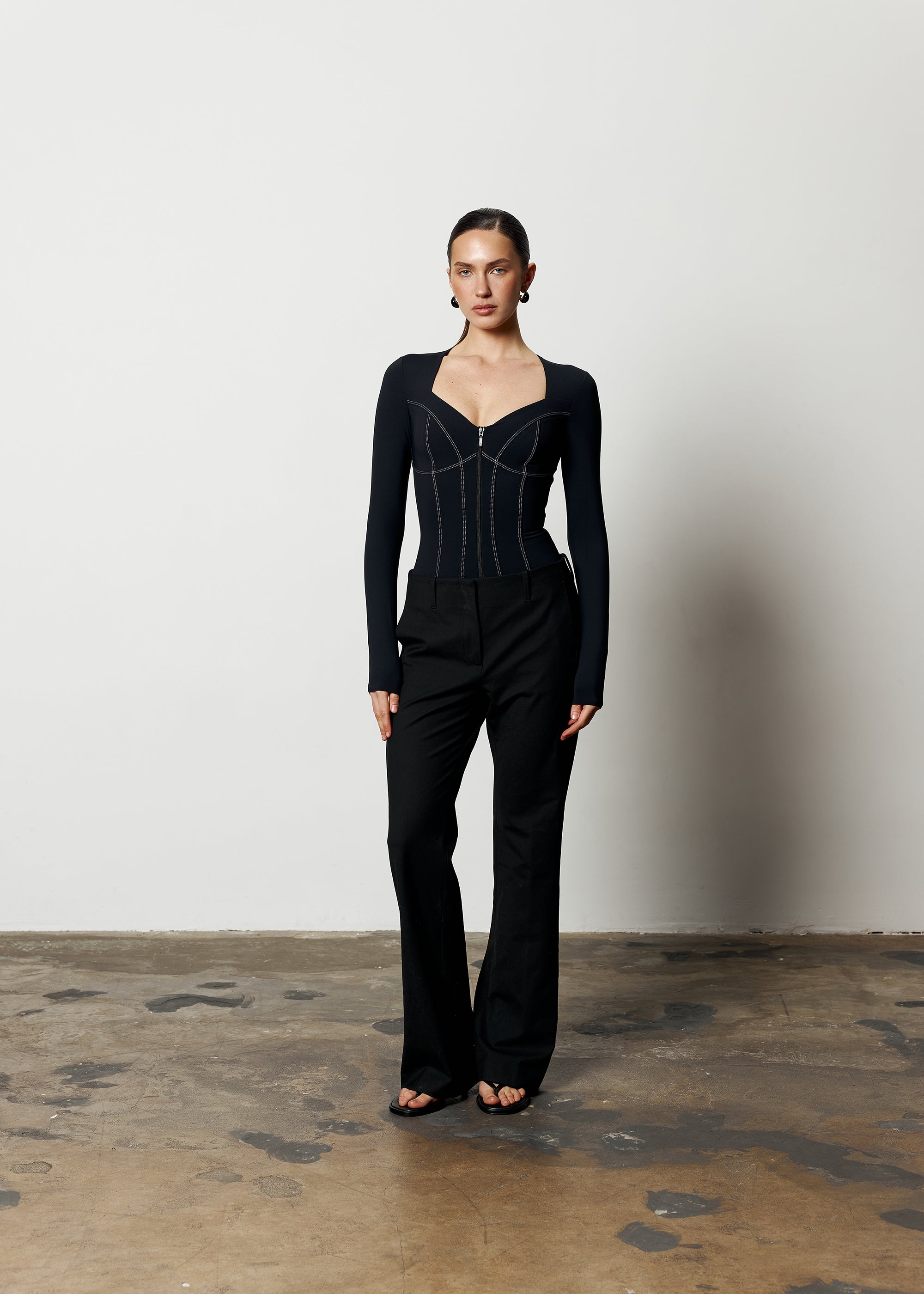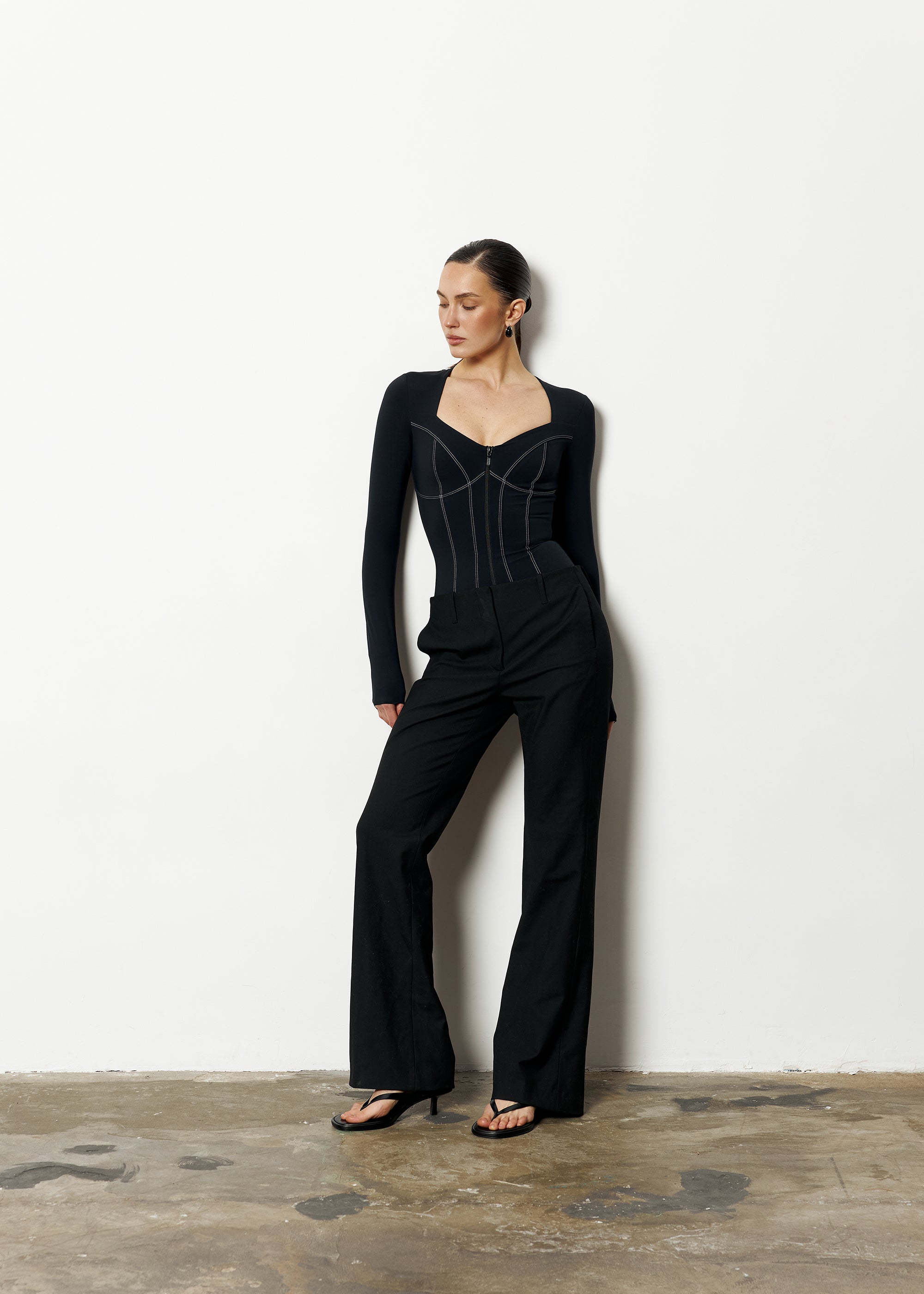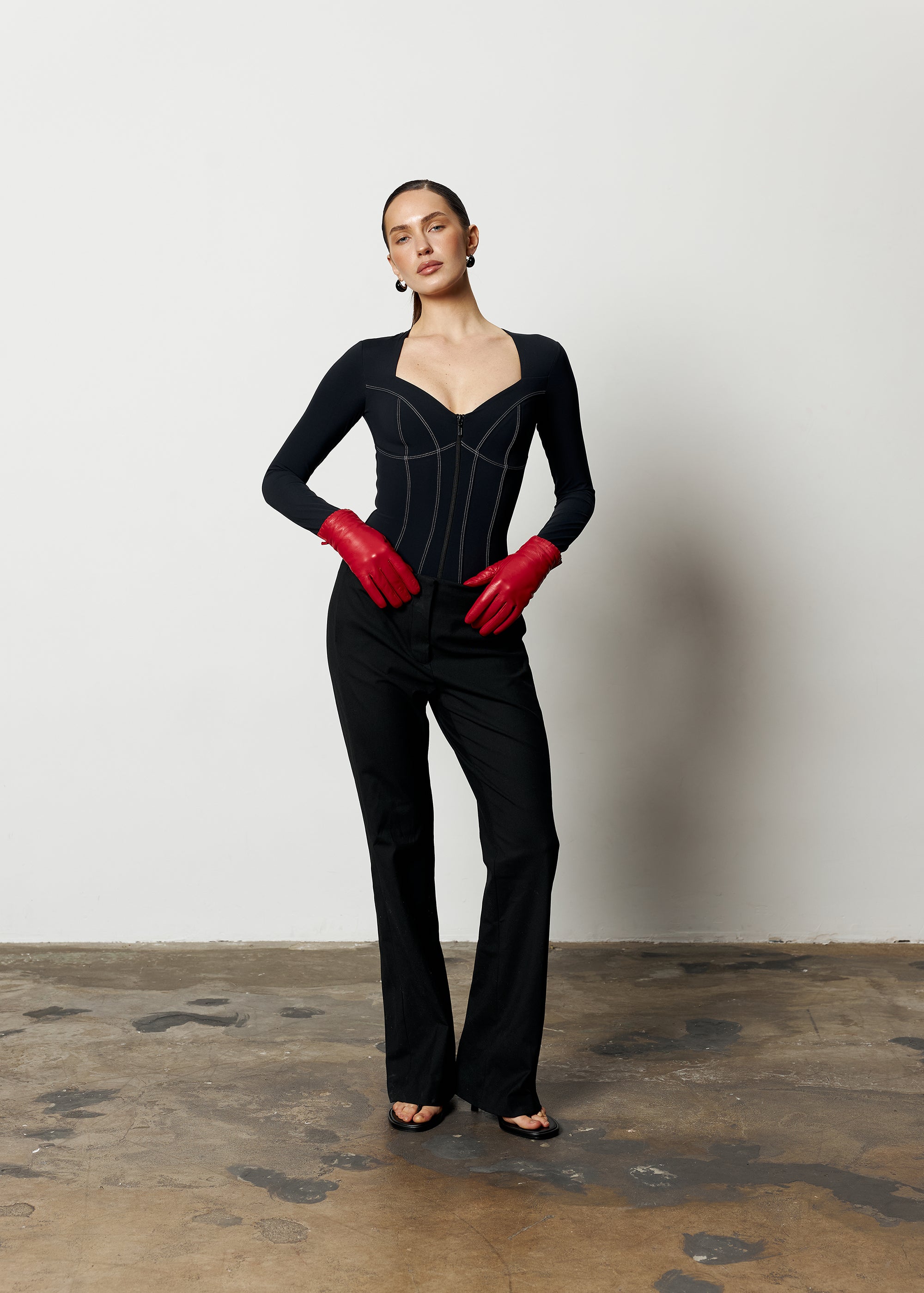 Класичне корсетне боді ÓDA з довгим рукавом, виконане з італійського біфлексу Carvico. Модель має подвійний внутрішній корсет, що забезпечує виражений моделюючий та утягуючий ефект, не просвічує та надійно тримає форму.