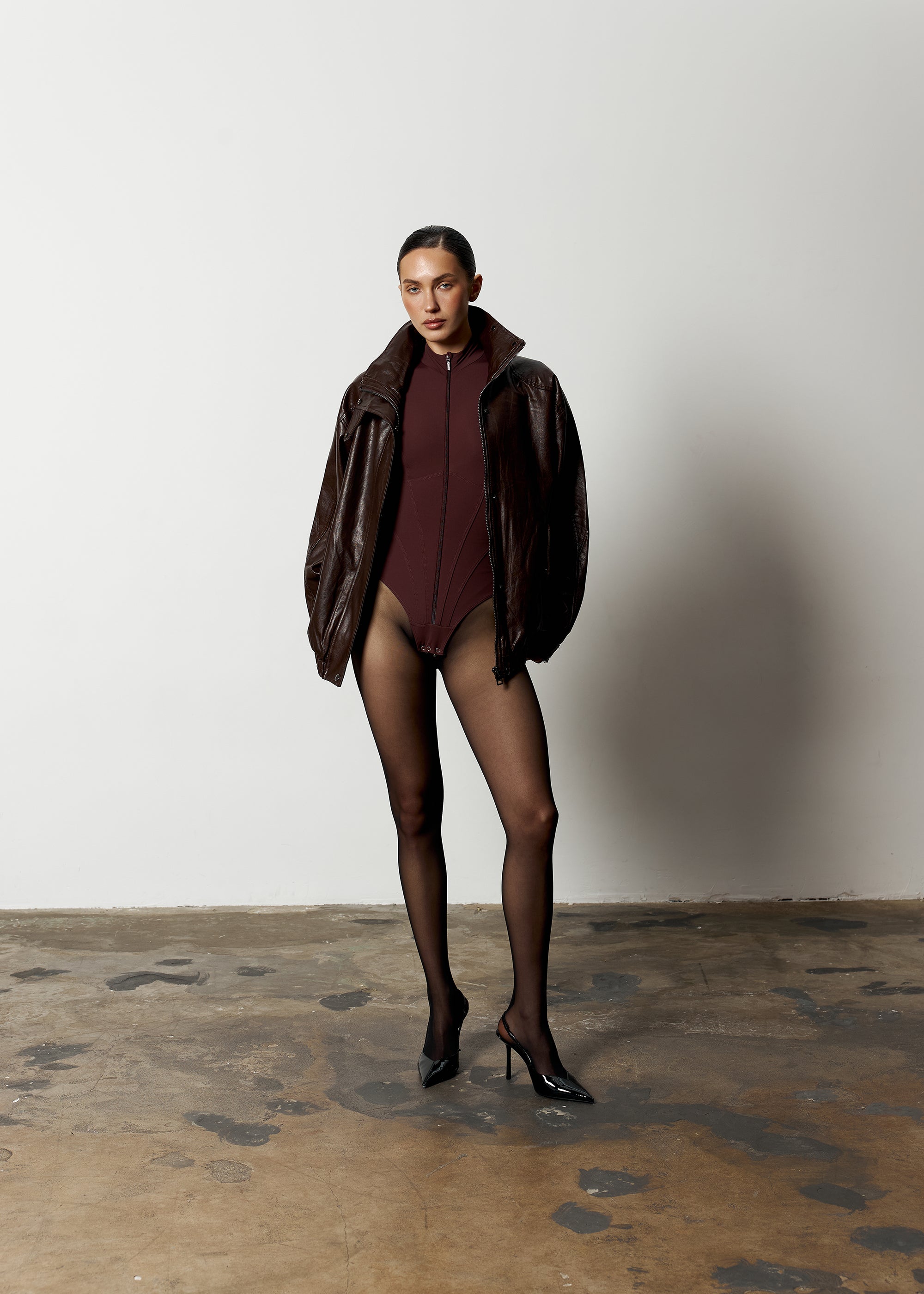 Корсетний боді WAKANDA з довгим рукавом, виконаний з італійського біфлексу Carvico. Модель має подвійний внутрішній корсет, що забезпечує виражений моделюючий та утягуючий ефект, не просвічує та надійно тримає форму.