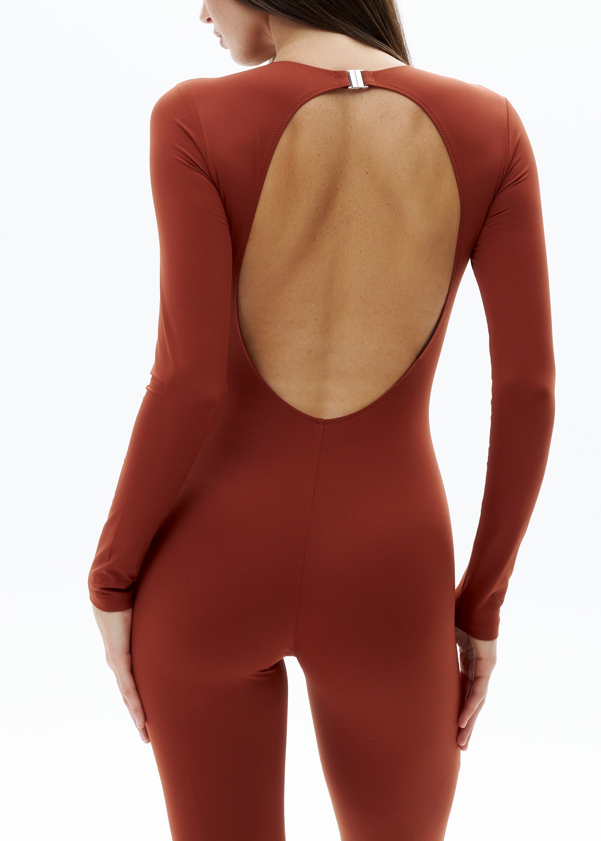 Jumpsuit with long sleeves and an open back.