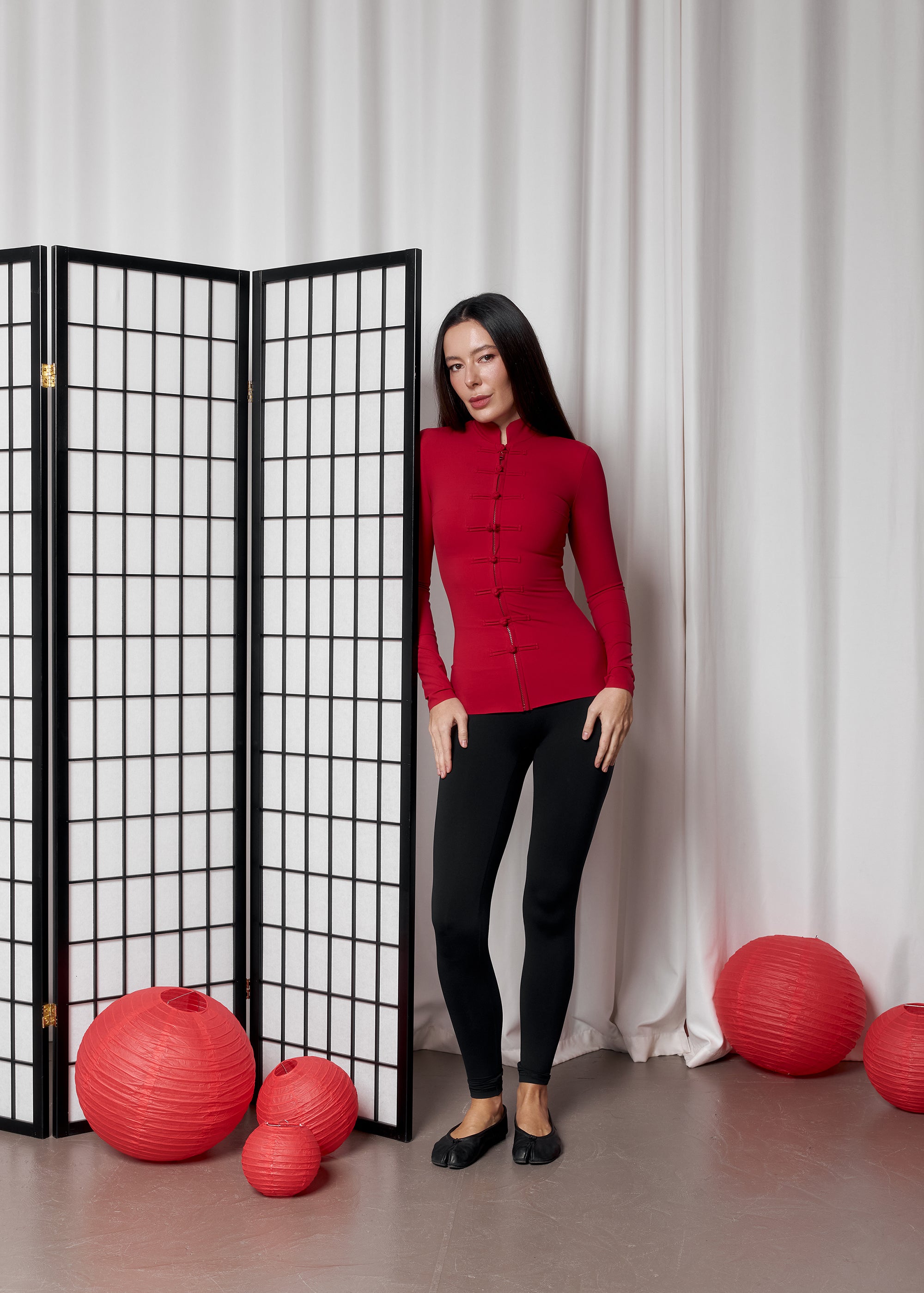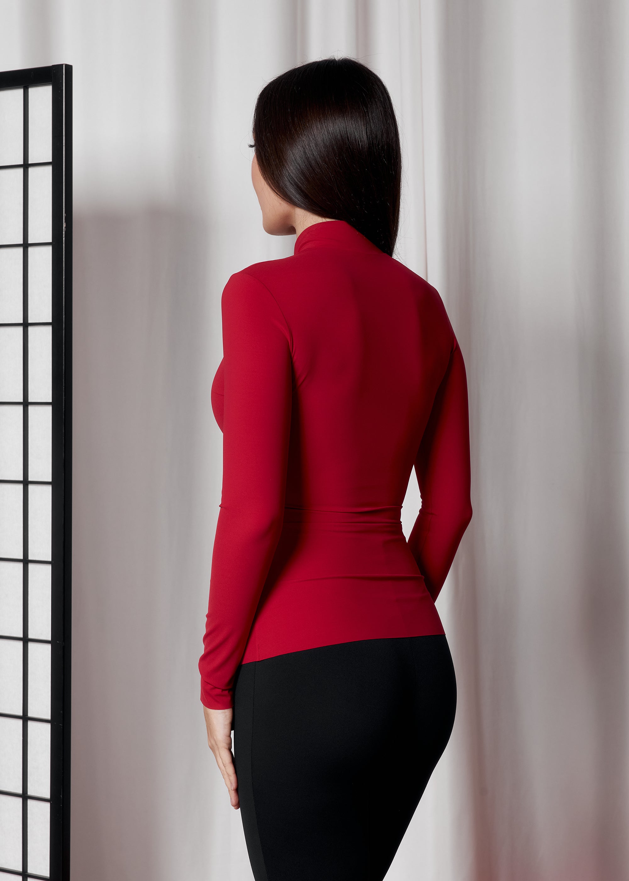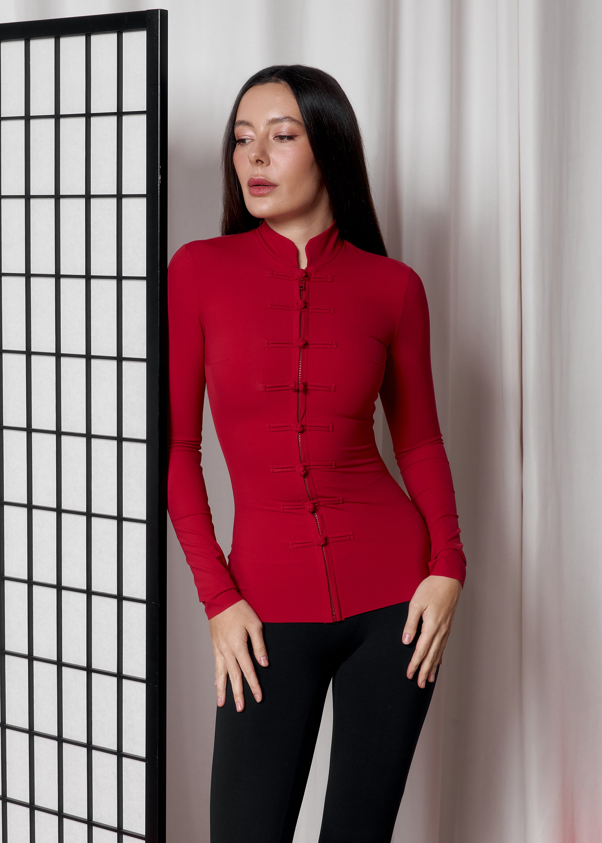 Облягаючий топ з високим коміром та центральною лінією застібок, що витягує силует.