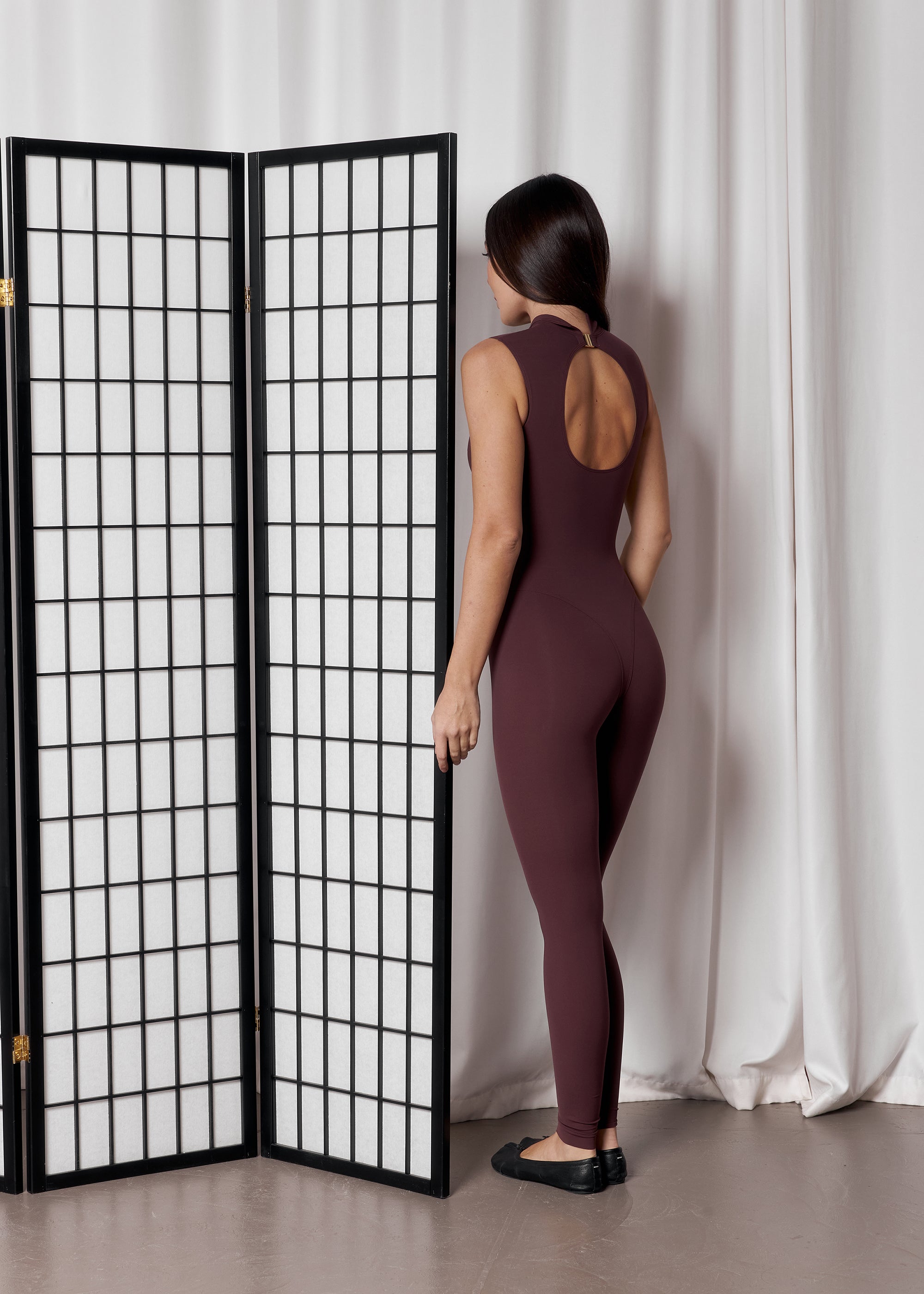 Лаконічний комбінезон з високим коміром та чіткою лінією плеча, що підкреслює поставу.