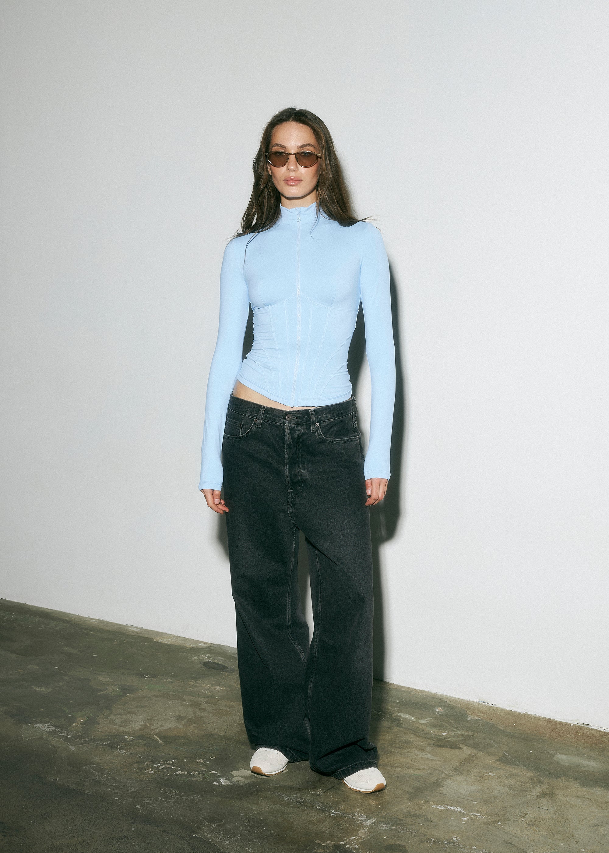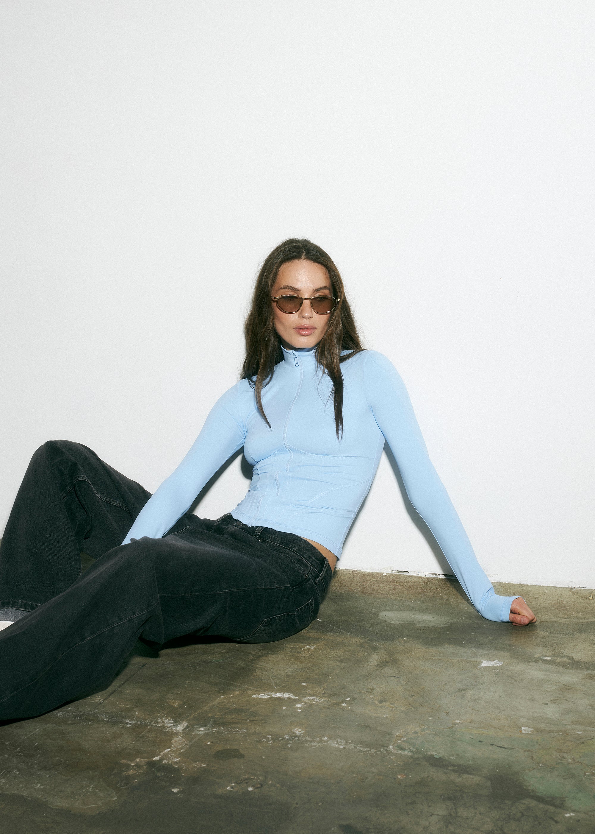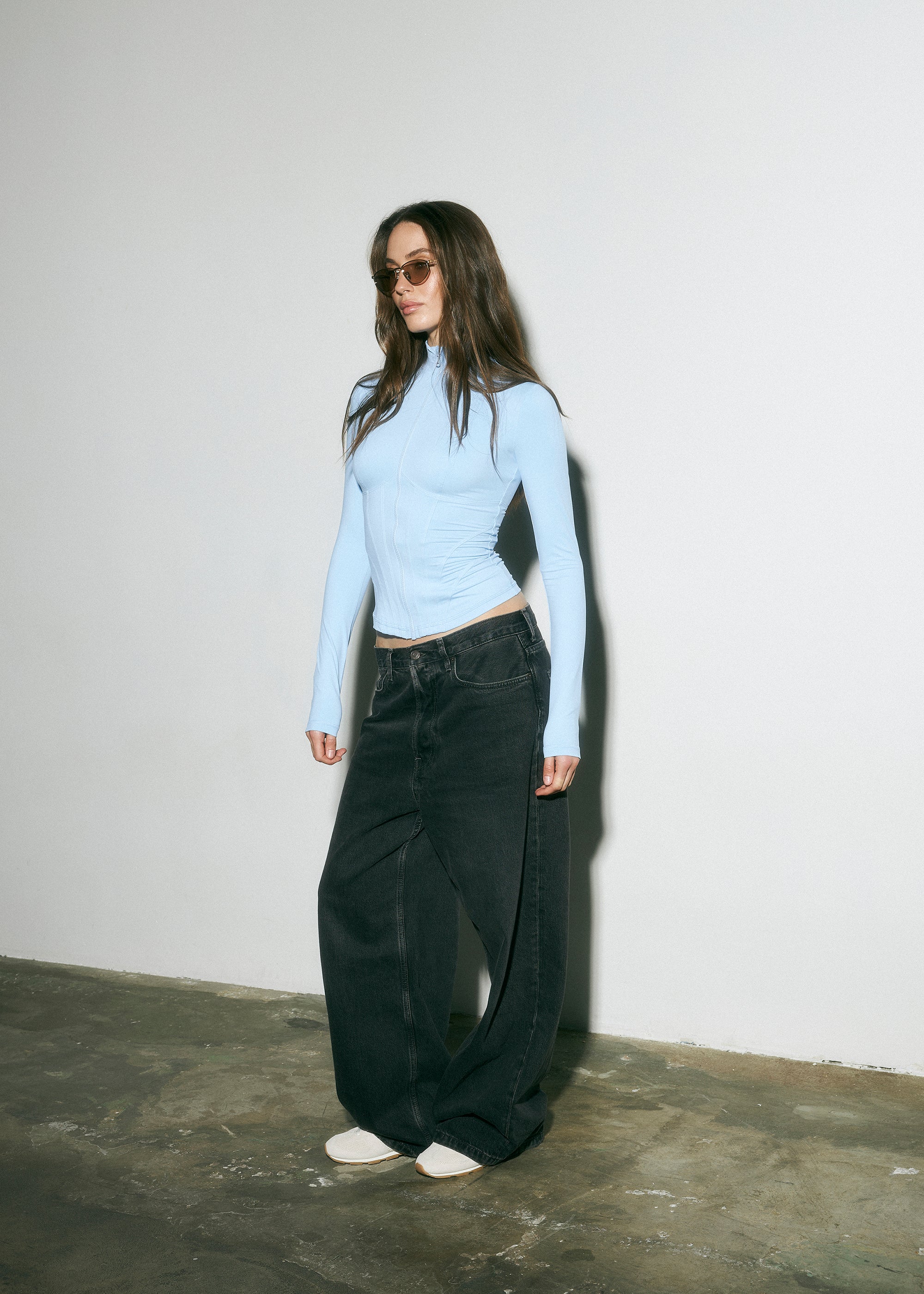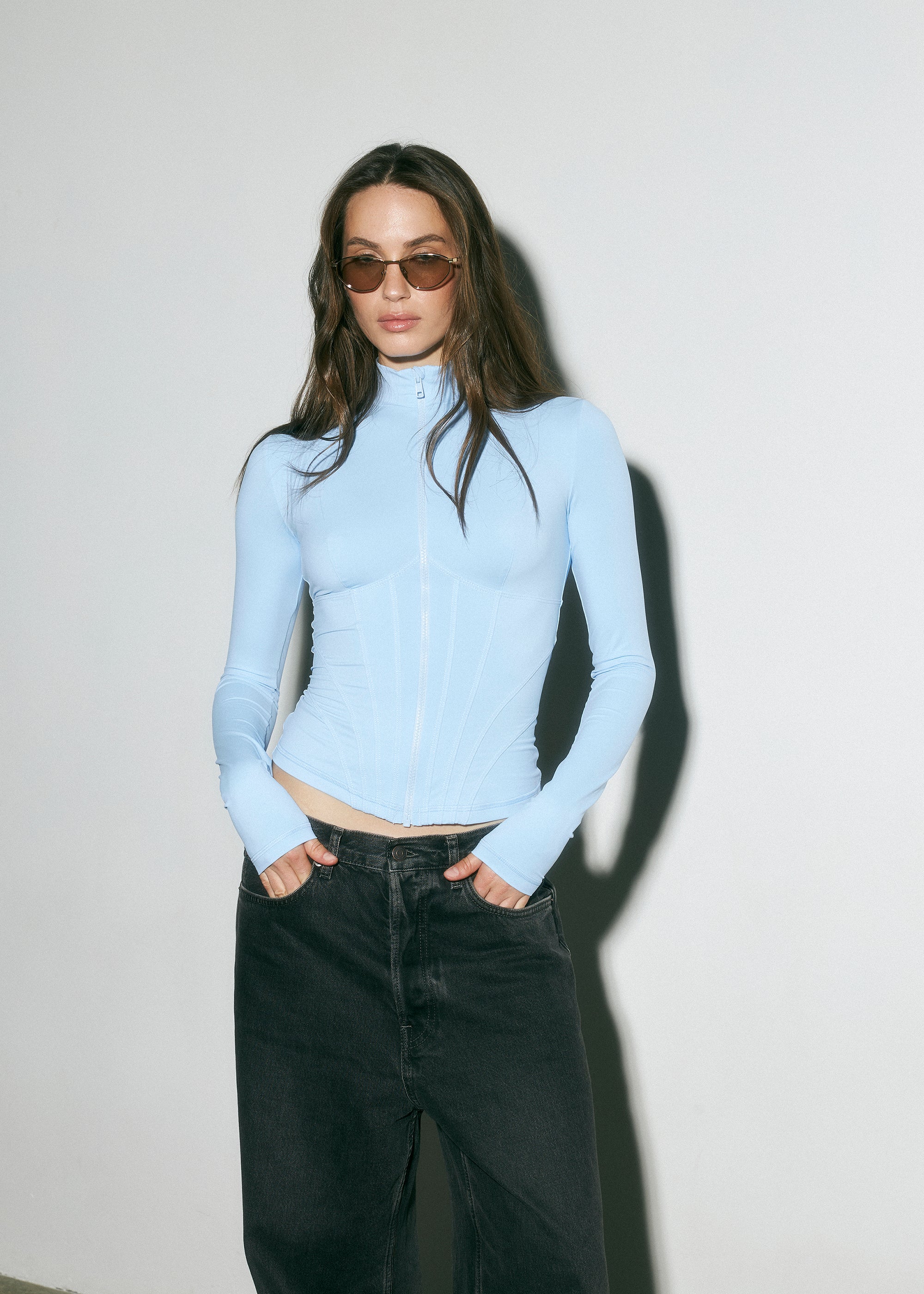 Силуетний топ з довгими рукавами, що делікатно повторює контури тіла та формує лінію талії.