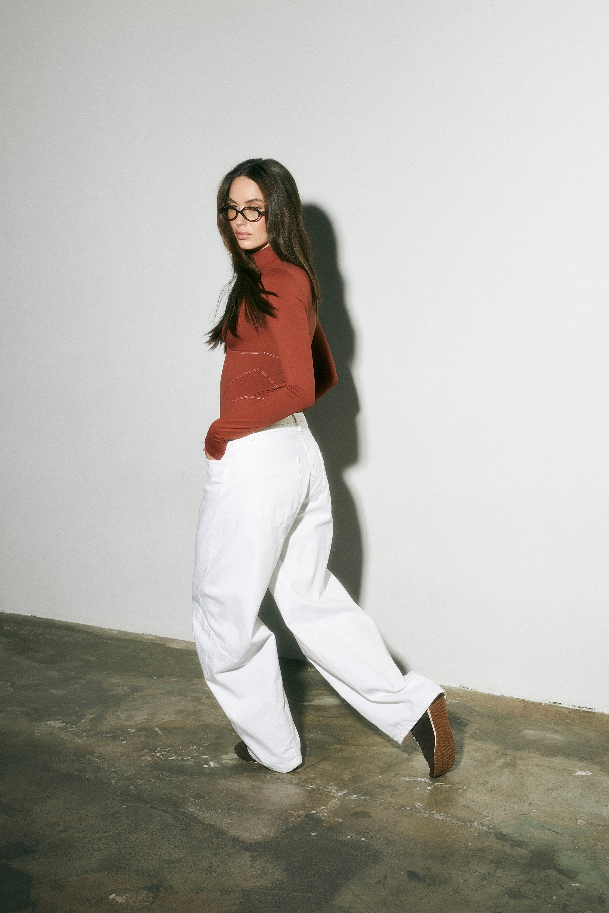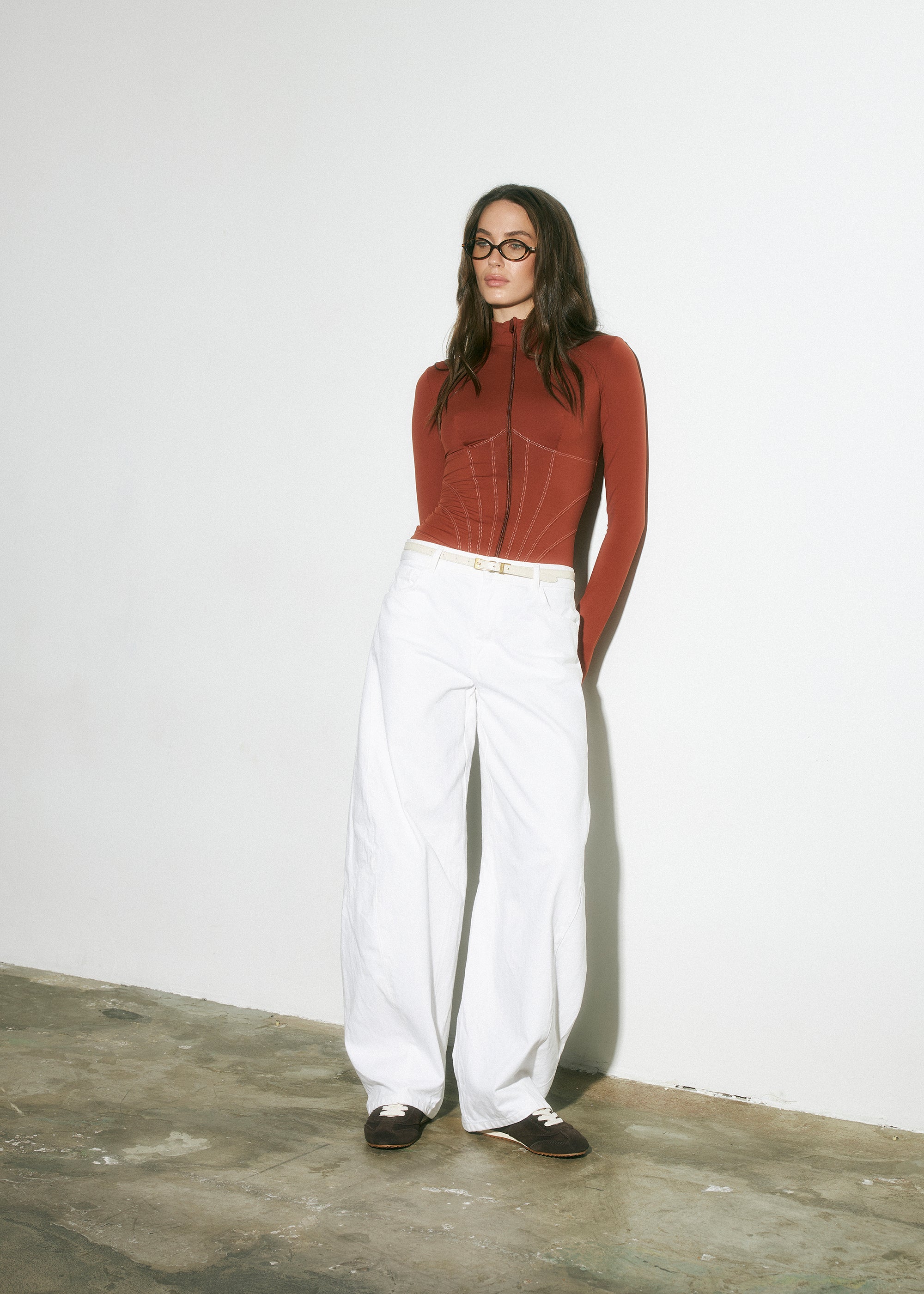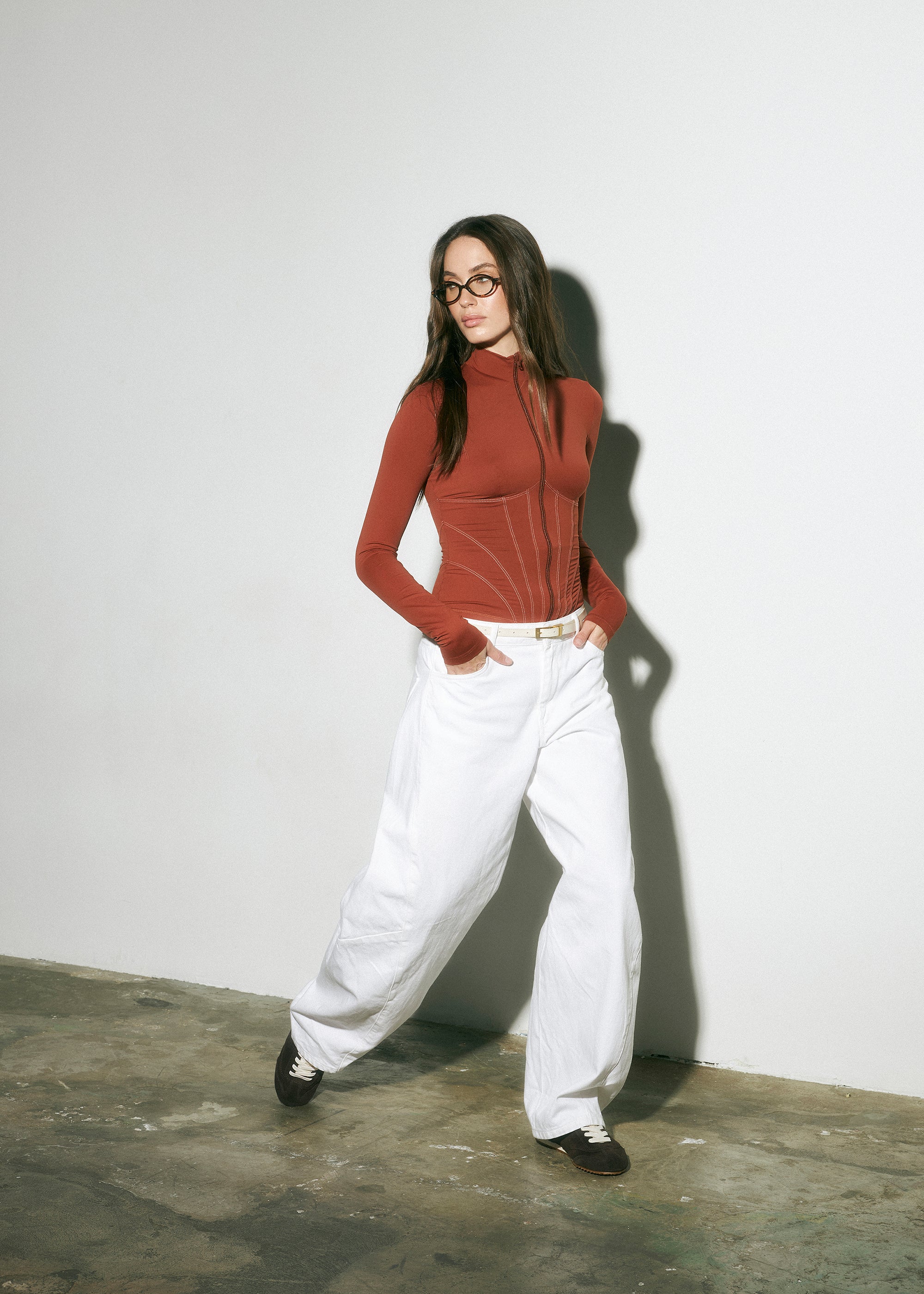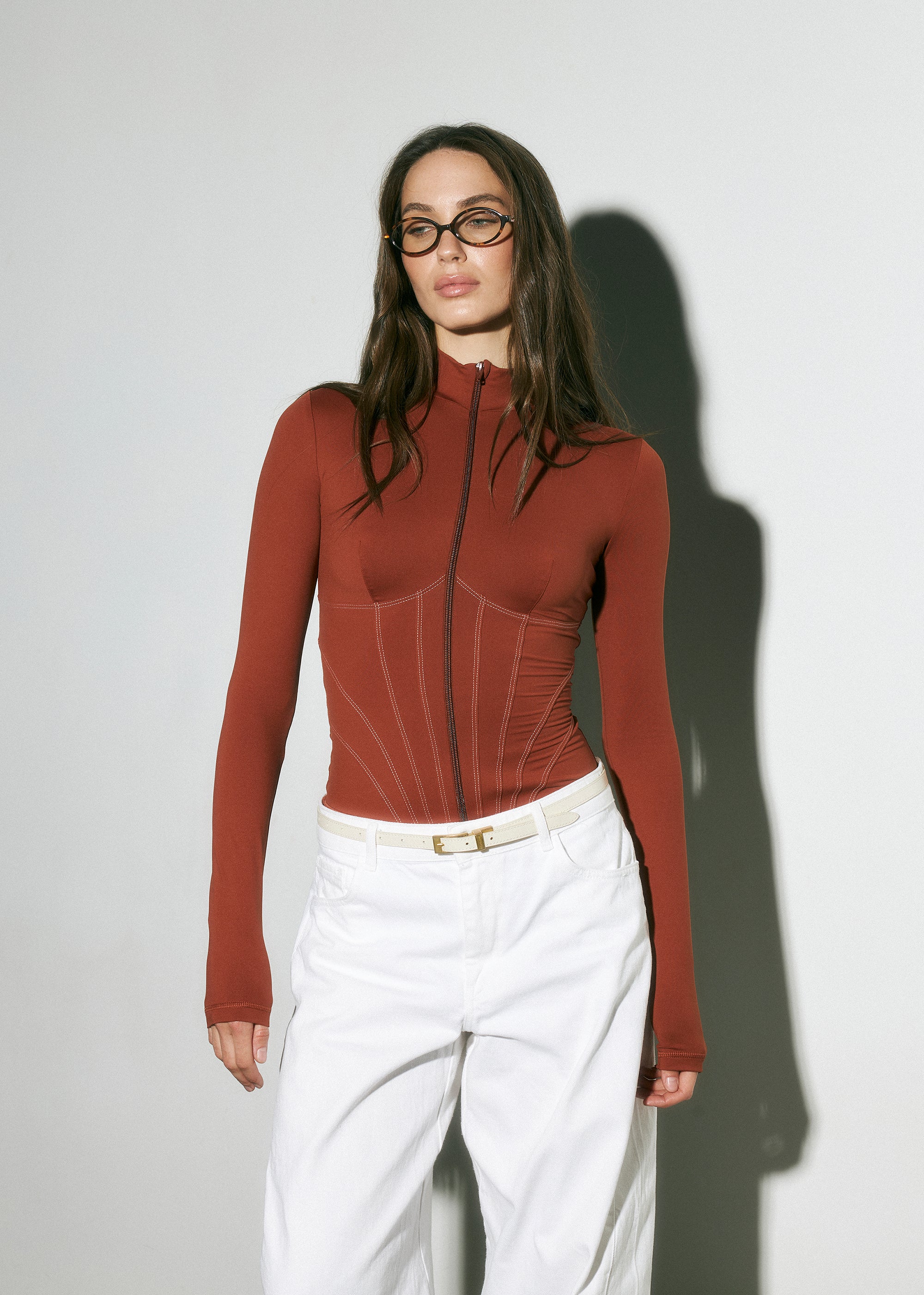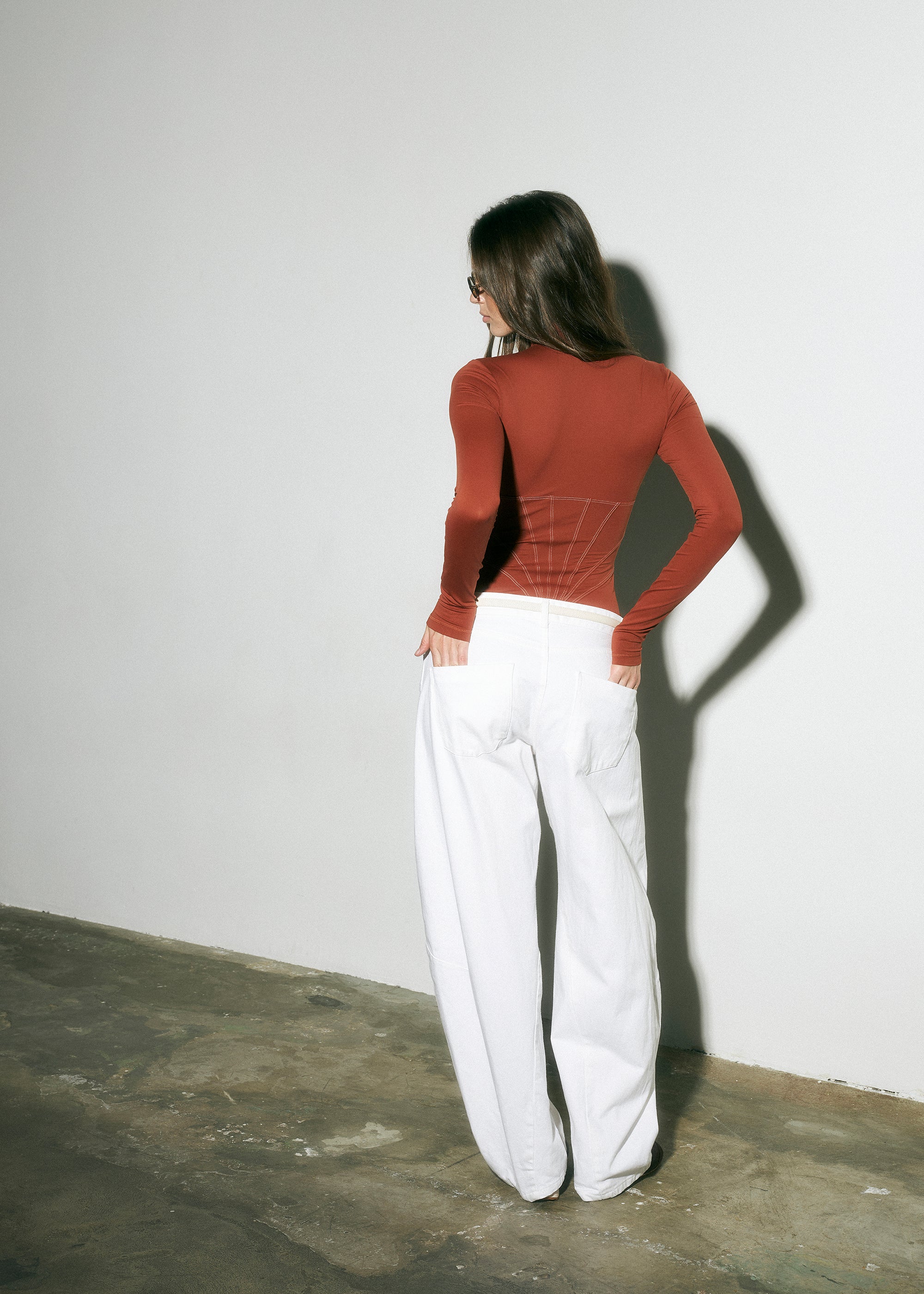 Силуетний топ з довгими рукавами, що делікатно повторює контури тіла та формує лінію талії.